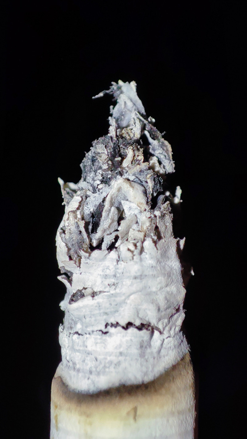 Крупноплановое изображение верхней части сигареты с плотным слоем пепла и следами активного горения. Видны крошящиеся фрагменты пепла, деформация бумаги и потемневший табак в зоне тления. Чёрный фон полностью изолирует объект и концентрирует внимание на деталях структуры и следах температуры. Фотография подходит для иллюстраций, посвящённых табакокурению, вредным привычкам, медицинским исследованиям, антинаркотическим и профилактическим материалам, а также для визуального контента о рисках для здоровья.
