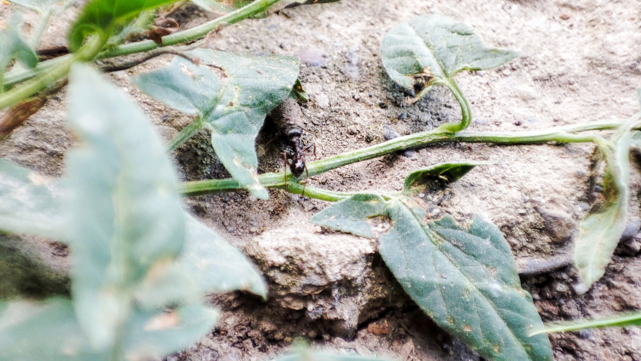 Жук-усач с вытянутыми усиками на грунтовой поверхности