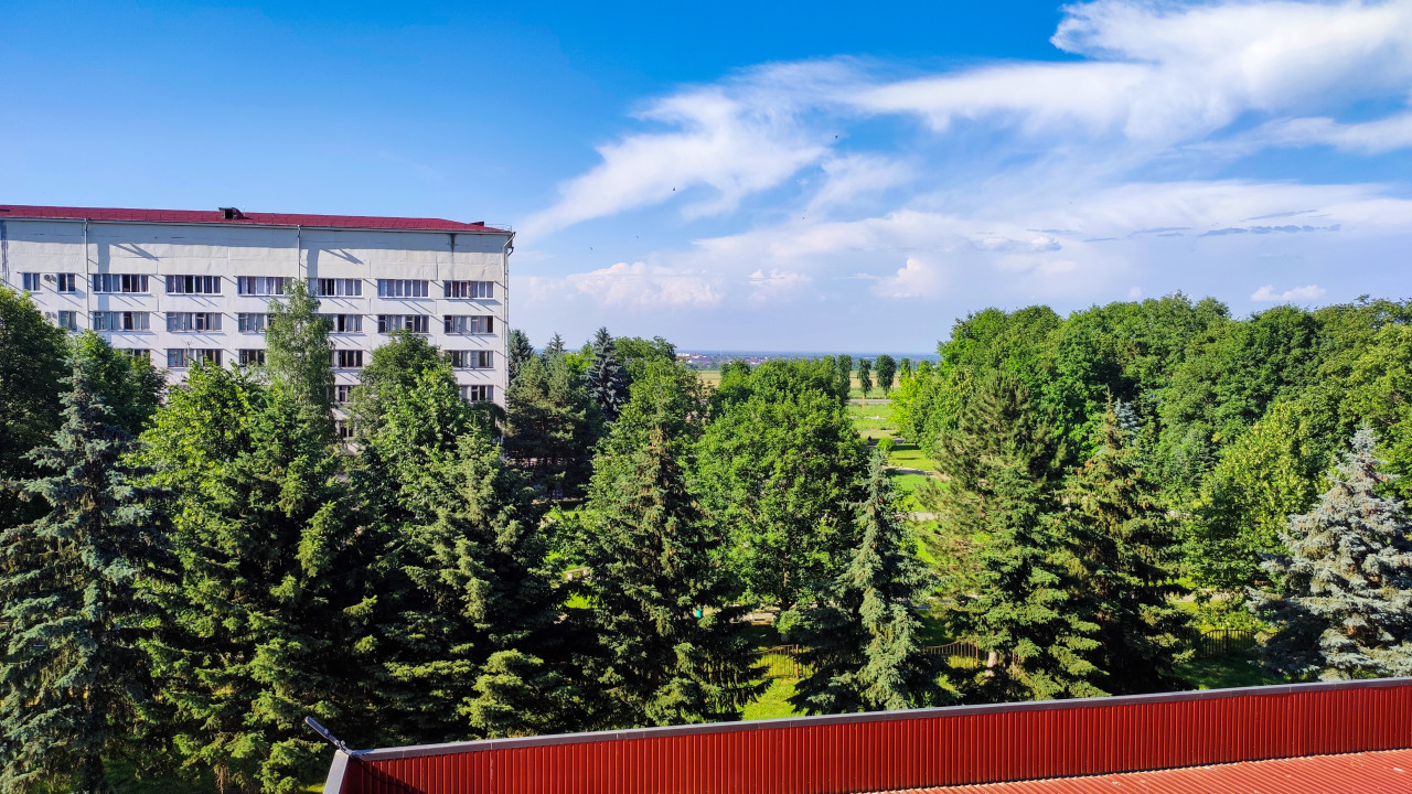 Плоская крыша с видом на фасад здания из кирпича и панелей