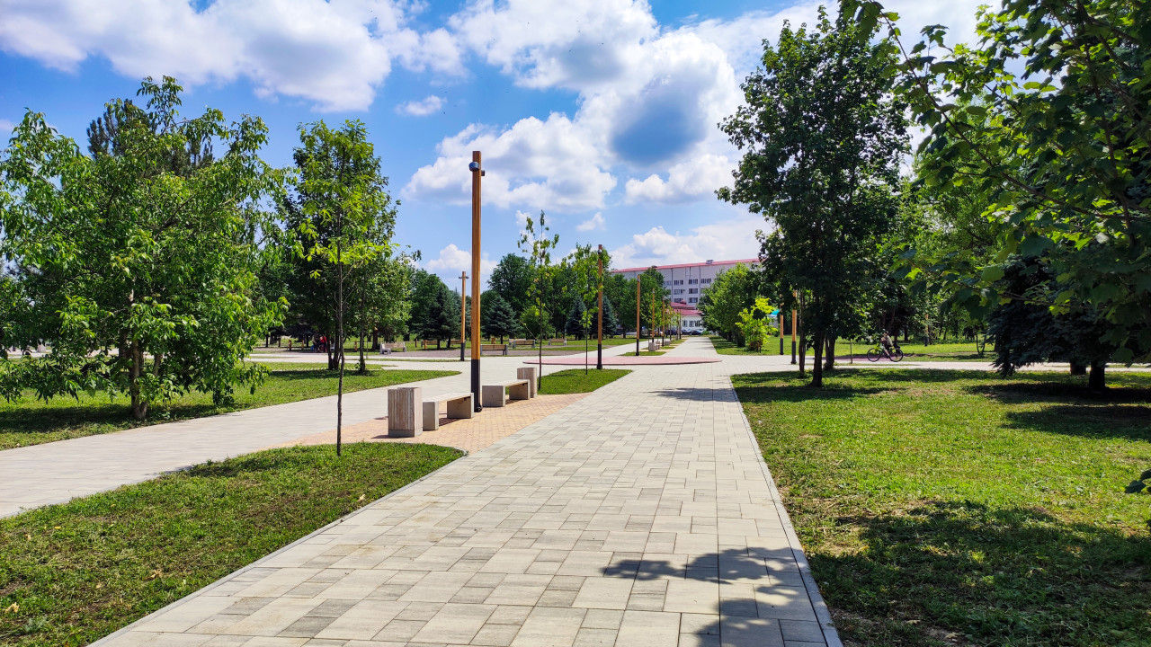 городская среда парк общественное пространство пешеходная зона дорожка тротуарная плитка благоустройство озеленение деревья газон скамейки уличное освещение инфраструктура прогулка лето дневной свет городской парк ландшафтный дизайн рекреационная зона городская инфраструктура пешеходные маршруты спокойная сцена городское пространство отдыхПохожие фотографии