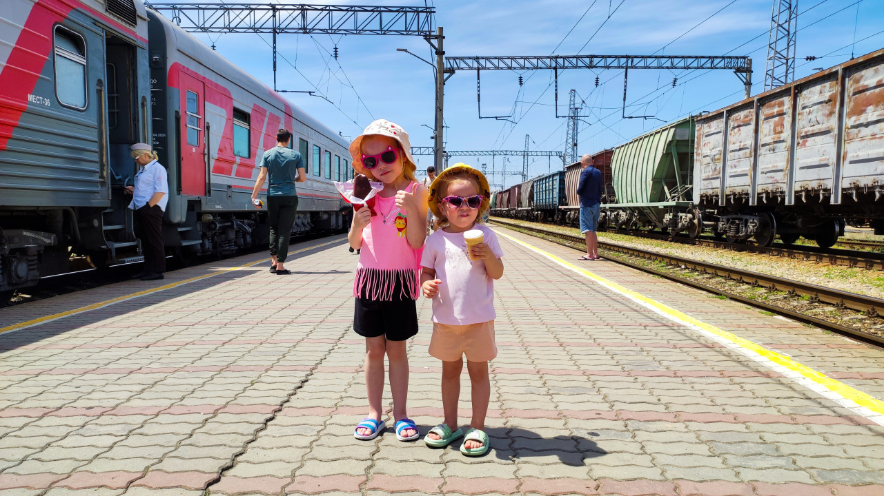 Дети на платформе между пассажирским поездом и грузовыми вагонами