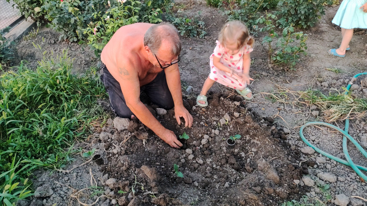 На фото запечатлён процесс посадки рассады на приусадебном участке. В кадре виден взрослый мужчина, работающий с почвой руками, и маленький ребёнок рядом, наблюдающий за процессом. На земле различимы лунки с молодыми растениями, садовый шланг, обработанная грядка и окружающие кустарники. Съёмка выполнена на открытом воздухе при дневном освещении. Изображение может использоваться для материалов о семейном садоводстве, огороде, сельском образе жизни и совместной работе на участке.