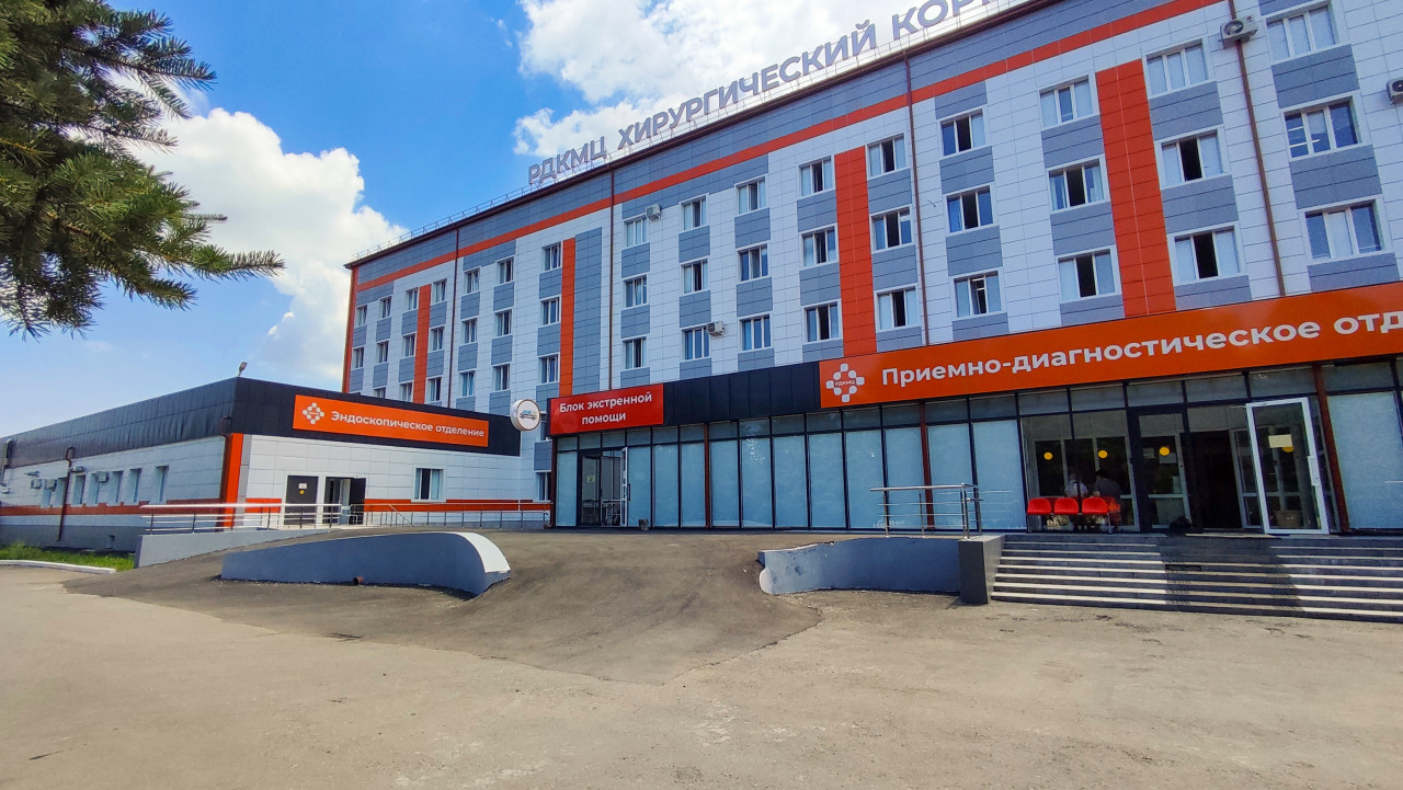 На снимке показан комплекс зданий медицинского учреждения с обозначениями «Эндоскопическое отделение», «Блок экстренной помощи» и «Приёмно-диагностическое отделение № 2». Видны фасады с облицовочными панелями, остеклённые входы, пандусы, подъездные пути и элементы навигации. Территория благоустроена, вокруг расположены деревья. Фотография сделана днём. Кадр может использоваться для материалов о системе здравоохранения, экстренной медицинской помощи и городской социальной инфраструктуре.