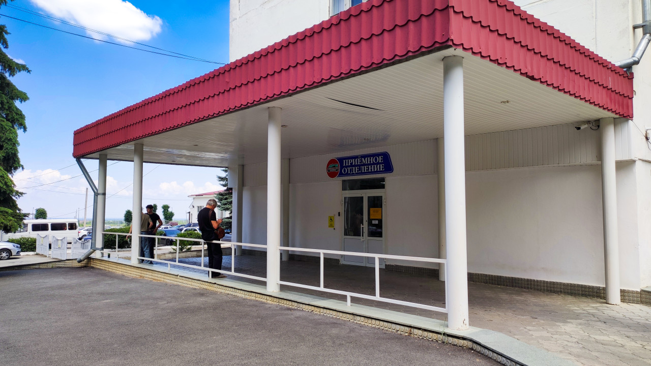 Фотография демонстрирует входную зону приёмного отделения медицинского учреждения с навесом, опирающимся на колонны. В кадре видны пандус, перила, входные двери с табличкой, асфальтированная площадка и элементы окружающей городской среды. Присутствуют посетители у входа. Съёмка выполнена днём. Изображение подходит для иллюстрации тем здравоохранения, доступности медицинских услуг и работы больничной инфраструктуры.