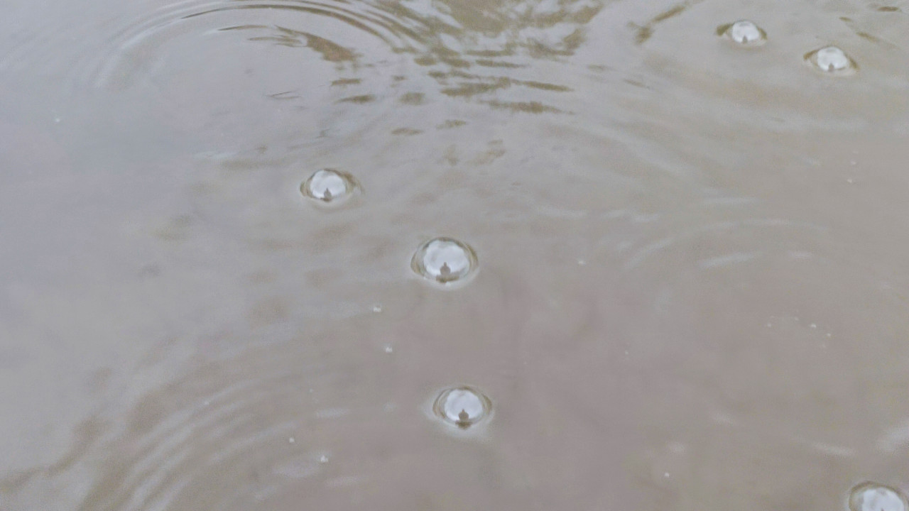 На фотографии запечатлена поверхность дождевой лужи с мутной водой, в которой видны пузырьки воздуха, поднимающиеся со дна, и расходящиеся концентрические круги от падающих капель дождя. Вода имеет светло-коричневый оттенок из-за примесей грунта. Кадр снят на улице во время или сразу после осадков, без видимых ориентиров окружающей среды. Изображение может использоваться в материалах о погодных явлениях, осадках, сезонных изменениях, а также как абстрактный фон, иллюстрация дождя и природных процессов.