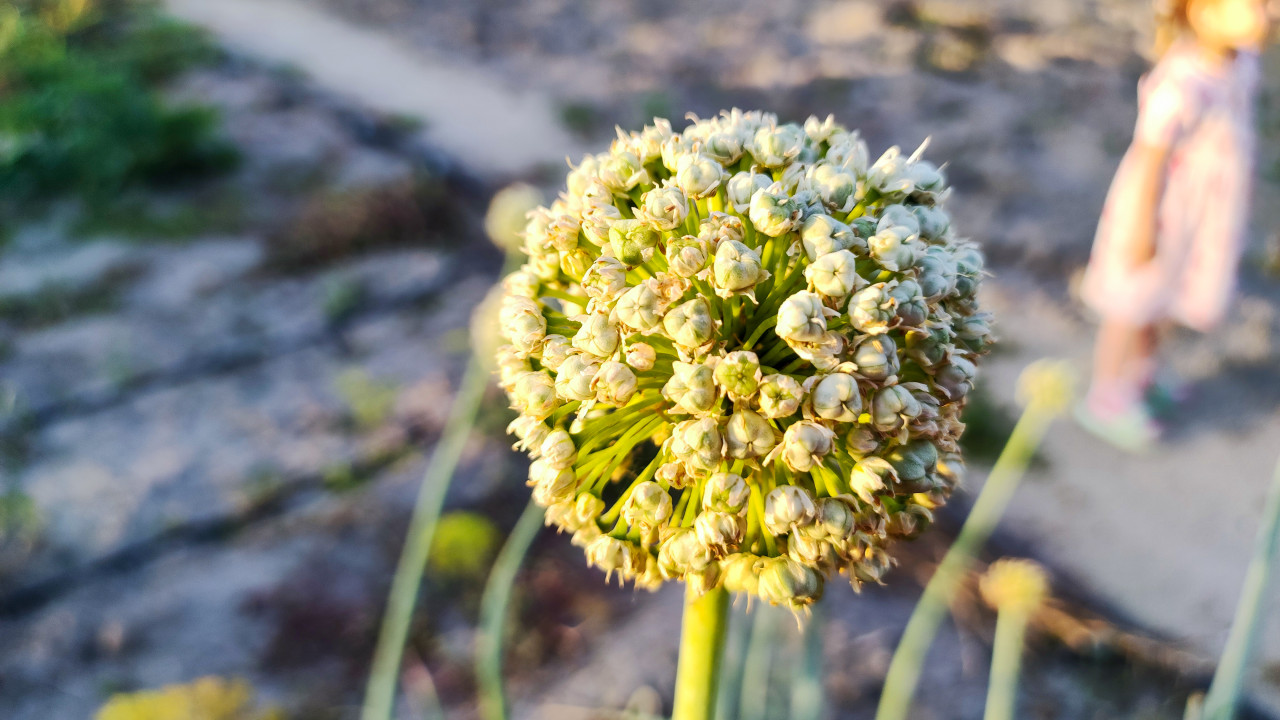 На изображении зафиксировано шаровидное соцветие лука, состоящее из множества бутонов, расположенных на длинном прямом цветоносе. В кадре отчётливо видна структура соцветия и зелёные цветоножки. На заднем плане с сильным размытием различимы элементы огорода и силуэт человека, не являющийся основным объектом съёмки. Снимок сделан на приусадебном участке при дневном свете. Фотография подходит для иллюстрации тем, связанных с выращиванием овощей, сельским бытом и сезонными работами в огороде.