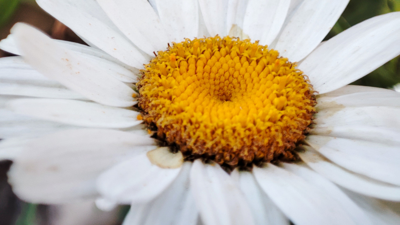 На фотографии изображена серединка цветка ромашки без насекомых. В кадре хорошо различима жёлтая центральная часть соцветия с мелкими цветками и окружающие её белые лепестки. Видна текстура пыльцы и деталей цветка, фон размытый и представлен зелёной растительностью. Съёмка выполнена на открытом воздухе при естественном освещении. Изображение может использоваться в материалах о ботанике, строении цветков, природных текстурах и сезонных растениях.
