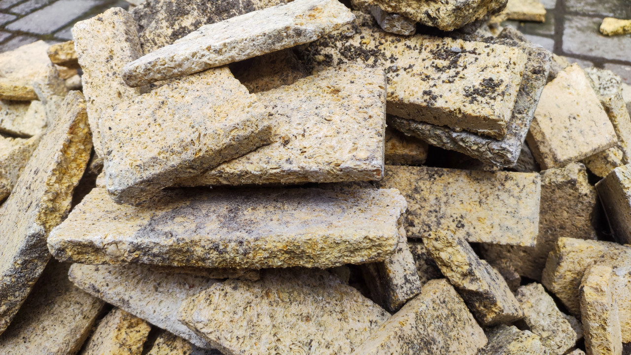 Фотография демонстрирует плиты медового кладочного известняка, сложенные в кучу и снятые крупным планом. Отчётливо видны пористая структура, слоистость и естественные неровности поверхности. Камень имеет характерный светло-жёлтый оттенок с тёмными включениями. Такой материал используется для облицовки, мощения дорожек и парковок, устройства отмосток, патио и каминов. Изображение может применяться в материалах о строительстве, выборе натурального камня и дизайне экстерьеров.
