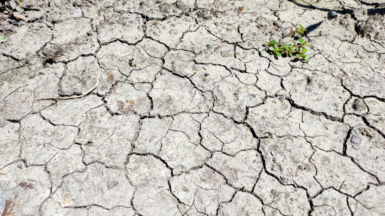 На фотографии показан участок сухой почвы светло-серого цвета с плотной сеткой трещин различной формы и глубины. Поверхность земли неровная, с мелкими камнями, частицами грунта и редкими растительными остатками. В правой верхней части кадра заметно небольшое зелёное растение, развивающееся непосредственно из трещины. Съёмка выполнена при ярком дневном освещении, подчёркивающем текстуру грунта. Изображение может использоваться для иллюстрации тем, связанных с состоянием почвы, природными условиями, сельским хозяйством, экологией и фоновыми природными текстурами.