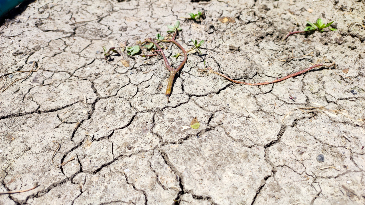 На снимке изображена пересохшая почва с выраженными трещинами, образующими неравномерный узор на поверхности земли. В кадре присутствуют сухие и полусухие побеги растений, отдельные зелёные листочки и фрагменты стеблей, лежащие на поверхности грунта. Цвет почвы светло-серый с включениями мелких камней и органических остатков. Фотография выполнена при прямом солнечном свете, что подчёркивает рельеф и структуру грунта. Снимок подходит для использования в материалах о природных условиях, состоянии земель, сельском хозяйстве и фоновых природных сюжетах.