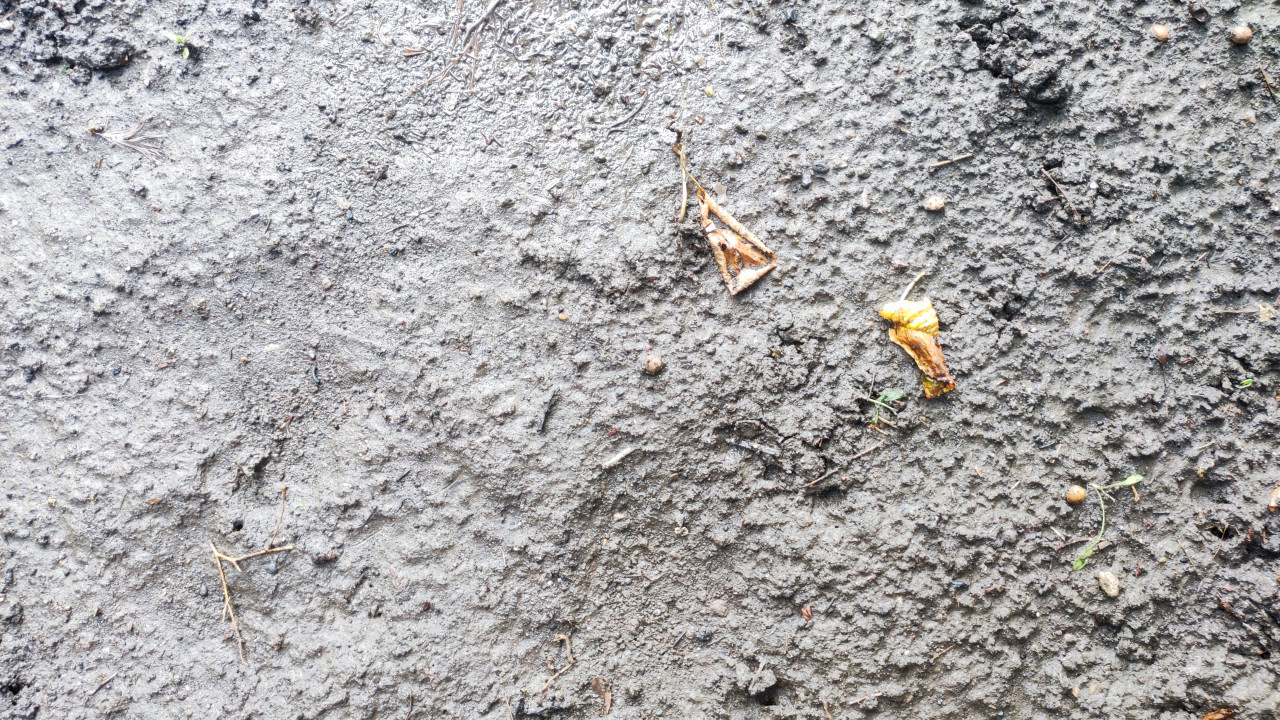 На фото представлена поверхность влажной серой почвы с неровной текстурой, на которой лежат небольшие фрагменты растительных остатков и мусора природного происхождения. Видны кусочки сухих листьев, стеблей и мелкие включения почвы, создающие неоднородный рисунок поверхности. Снимок сделан сверху, без выраженного центрального объекта, что подчёркивает фактуру грунта. Фотография может использоваться как фон или иллюстрация для тем экологии, почвоведения, природных процессов и сезонных изменений.