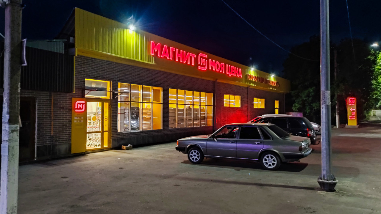 магазин супермаркет розничная торговля продуктовый магазин магнит моя цена ночной город фасад здания торговая сеть парковка автомобили городской пейзаж коммерческая недвижимость уличное освещение вечер ночь вход в магазин витрины торговый зал городская инфраструктура повседневная жизнь покупки экономика ритейлПохожие фотографии
