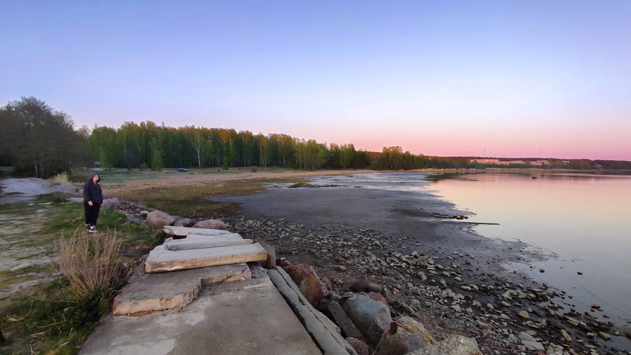 На изображении зафиксирован участок берега реки или озера в период пониженного уровня воды. В кадре заметны оголённые камни, влажный ил и спокойная водная поверхность, отражающая розово-голубые оттенки вечернего неба. На дальнем плане видна линия леса и открытое пространство противоположного берега. Слева присутствует человек, стоящий у кромки берега. Фотография сделана в вечернее время при мягком естественном освещении. Снимок подходит для иллюстраций на темы природы, сезонных изменений водоёмов, экологии, отдыха на природе и ландшафтной фотографии.