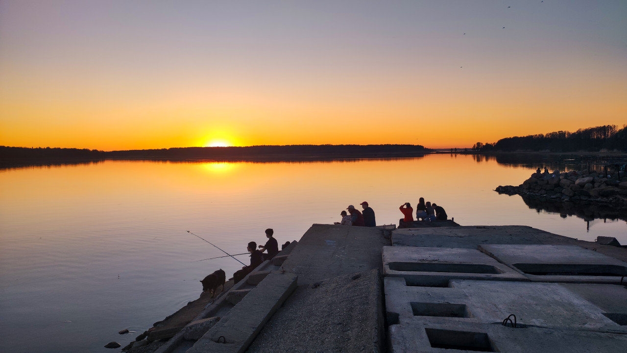 На фотографии запечатлён берег водоёма в момент заката солнца. В кадре видна гладкая поверхность воды, отражающая яркое оранжевое свечение заходящего солнца у линии горизонта. На бетонных плитах у берега расположились люди, часть из которых занимается рыбалкой, другие наблюдают за закатом. Силуэты людей подчёркнуты контрастом с освещённым небом и водой. На дальнем плане различимы лесные массивы и спокойный водный простор. Снимок подходит для использования в материалах о вечернем отдыхе, рыбалке, природе и спокойном досуге у воды.