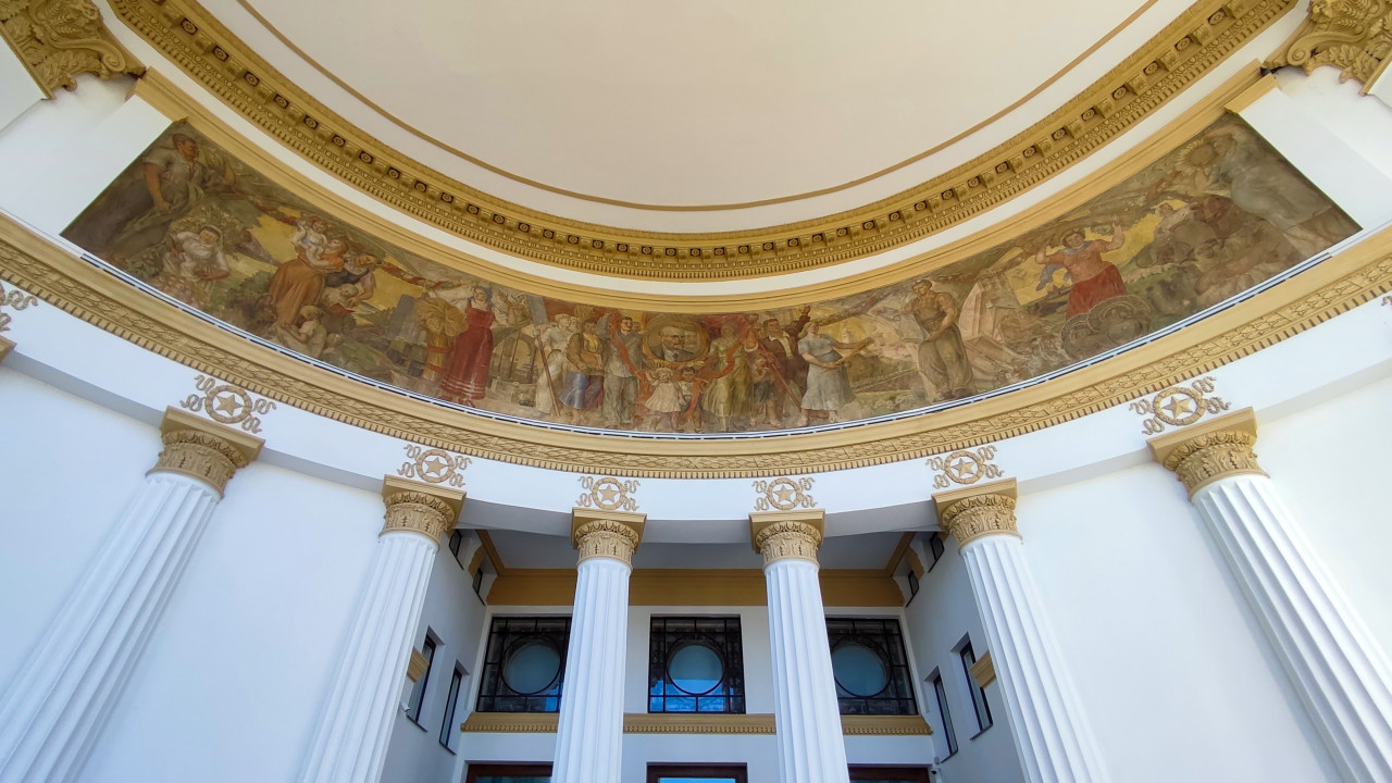 Фотография сделана под сводами портика павильона №71 ВДНХ и показывает внутреннее пространство с колоннами и монументальной фреской, расположенной по окружности лоджии. Павильон построен в 1952–1954 годах по проекту архитекторов Владимира Щуко и Владимира Гельфрейха и является объектом культурного наследия федерального значения. Фреска «Народы России построили социализм» относится к периоду советского оформления павильона и отражает идеологические и художественные принципы своего времени. Снимок может использоваться в материалах об архитектуре сталинского ампира, монументальной живописи СССР и исторических интерьерах ВДНХ.