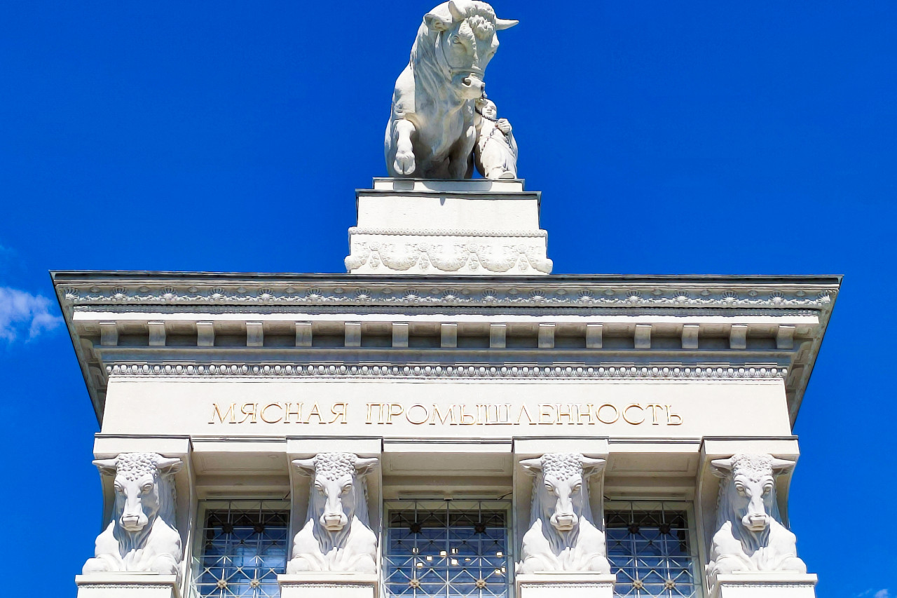 вднх москва архитектура павильон советская архитектура сталинский ампир объект культурного наследия памятник архитектуры историческое здание архитектурный декор монументальное искусство культурное наследие выставочный комплекс архитектура ссср туристический объект Москва ВДНХ павильон Мясная промышленность павильон 51 фасад колонны скульптура быка сталинский классицизм федеральное значение выставочный павильон архитектурный ансамбль история СССР архитектура МосквыПохожие фотографии