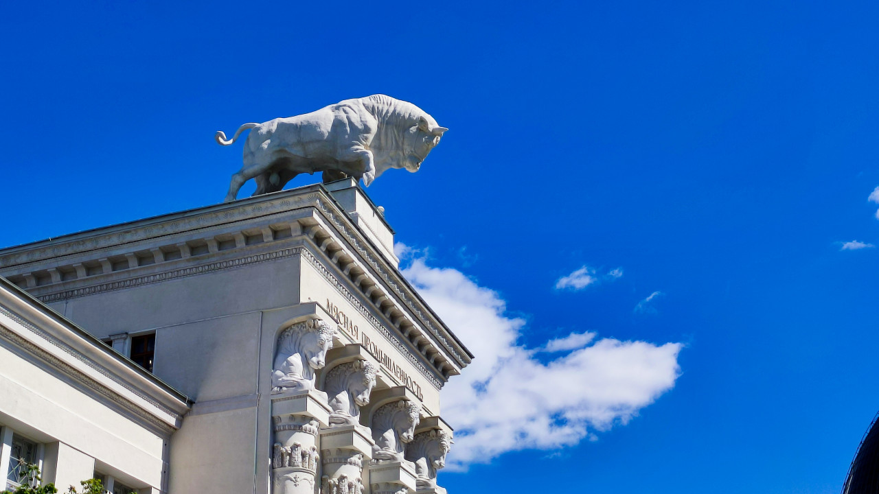 Фотография фиксирует фрагмент павильона «Мясная промышленность» ВДНХ с декоративной скульптурой быка, установленной на кровле здания. В кадре отчётливо видны архитектурные детали фасада, колонны и лепной декор, характерные для сталинского классицизма. Павильон был построен в 1954 году как часть Всесоюзной сельскохозяйственной выставки и символизировал развитие мясной промышленности СССР. Объект входит в состав охраняемого архитектурного ансамбля ВДНХ. Снимок подходит для иллюстраций об архитектурных деталях, культурном наследии и истории выставки.