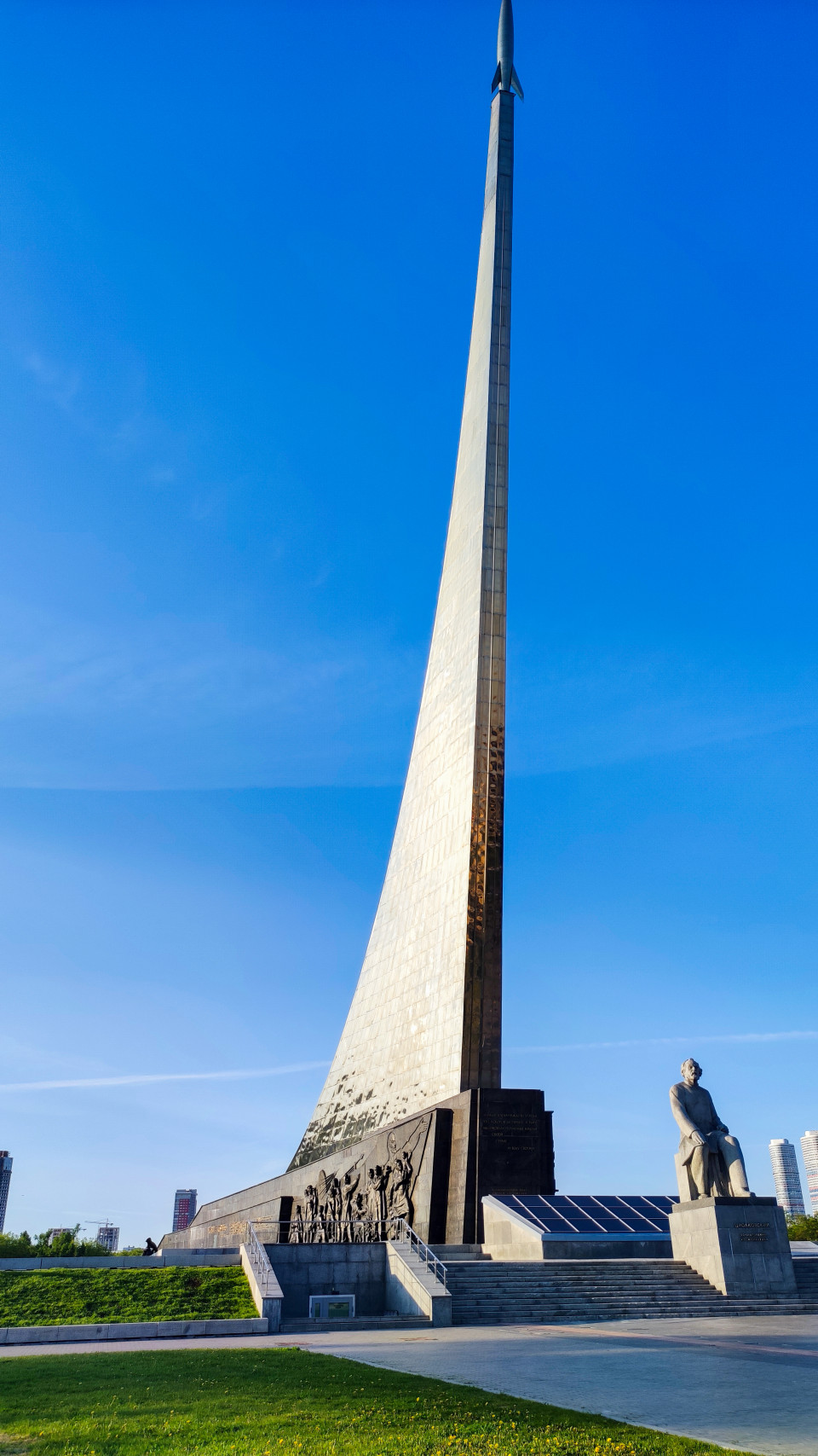 На снимке представлен боковой вид на монумент «Покорителям космоса», облицованный титановыми плитами, а также на скульптуру Константина Циолковского, расположенную у основания монумента. Виден рельеф, изображающий представителей профессий, внесших вклад в развитие космонавтики. На фоне отмечаются городские здания, небо и прогулочные зоны вокруг комплекса. На переднем плане расположена зелёная площадка и ступени, ведущие к монументу. Фото может быть использовано в материалах о космическом наследии, советской архитектуре и городской среде Москвы.