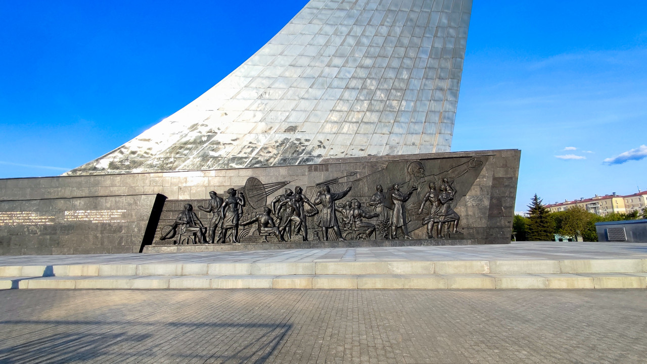 Боковой вид барельефа и стелы монумента «Покорителям космоса»
