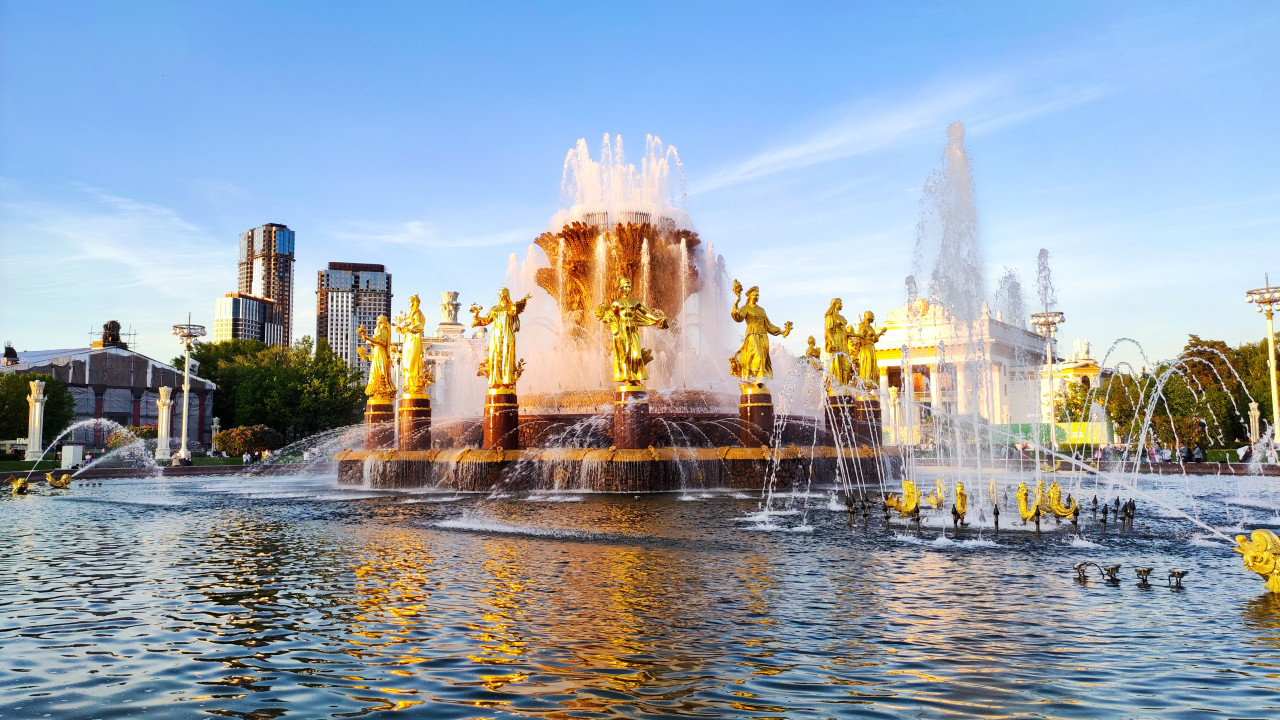 Фонтан «Дружба народов» на ВДНХ и современные здания на горизонте