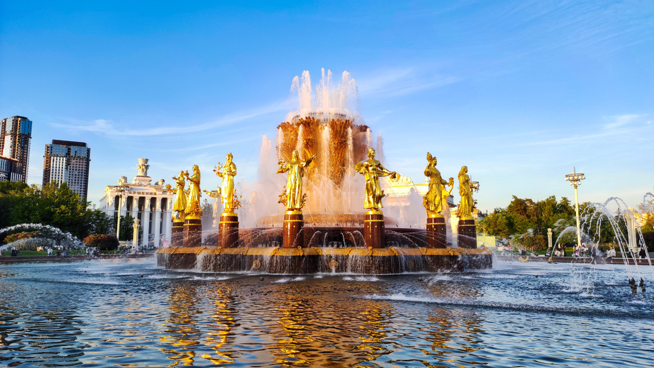 На фотографии изображён фонтан «Дружба народов» с позолоченными скульптурами, стоящими на гранитных пьедесталах, установленный на ВДНХ в 1954 году. Вода поднимается многоярусными струями, а поверхность бассейна отражает элементы архитектурного ансамбля. На заднем плане расположен павильон «Армения», построенный в 1954 году и являющийся объектом культурного наследия. Также видны прогулочные зоны, зелёные деревья и элементы городской инфраструктуры. Снимок подходит для туристических материалов, публикаций об архитектуре и истории выставки.