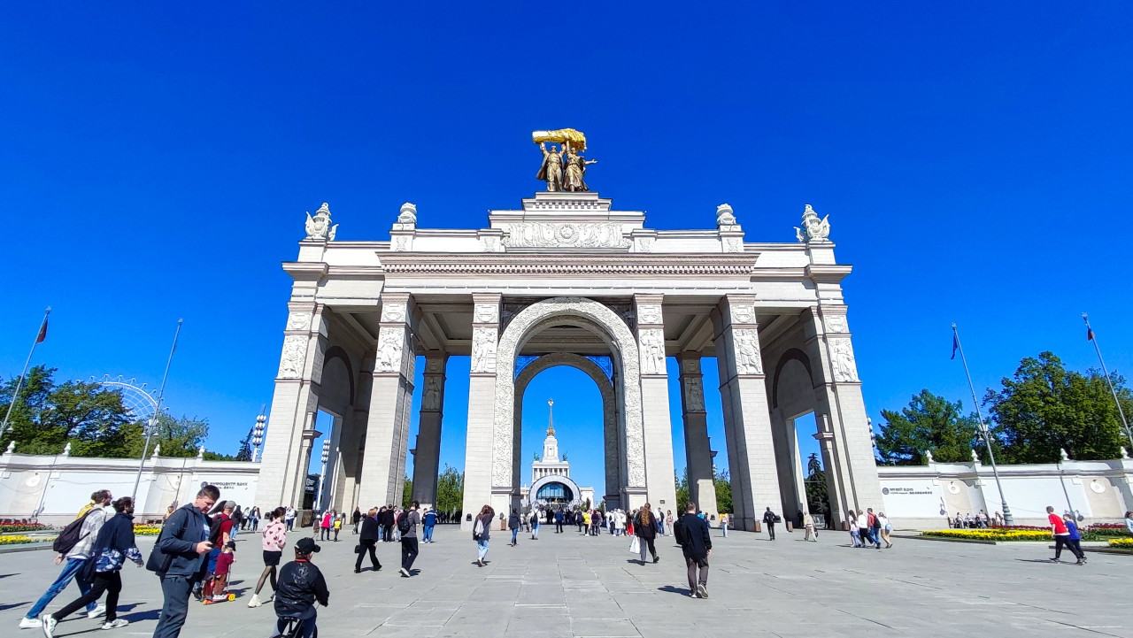 вднх москва архитектура культурное наследие объект культурного наследия памятник архитектуры советская архитектура архитектура ссср общественное пространство туристический объект городской пейзаж ВДНХ главный вход арка павильон №1 площадь посетители Москва туристы барельефы золотая скульптура сталинский ампир прогулочная зона выставочный центр флагштоки летний день ансамбль ВДНХ урбанистика центральная аллея исторический объект городская среда массовое посещение культурная территория СССРПохожие фотографии