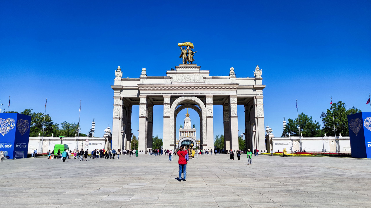 вднх москва архитектура культурное наследие объект культурного наследия памятник архитектуры советская архитектура архитектура ссср общественное пространство туристический объект городской пейзаж ВДНХ главный вход триумфальная арка культурный объект тракторист и колхозница скульптура площадь Москва туристы барельефы сталинский ампир выставочный центр историческое место прогулочная зона павильон №1 СССР монументальная архитектура входная группа летний день городской ландшафт символика выставка центральная аллея ансамбль ВДНХПохожие фотографии