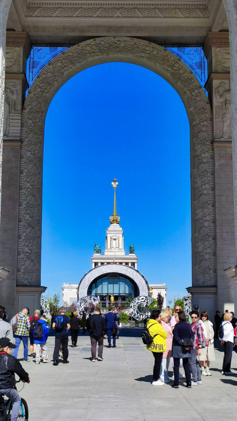 вднх москва архитектура культурное наследие объект культурного наследия памятник архитектуры советская архитектура архитектура ссср общественное пространство туристический объект городской пейзаж ВДНХ павильон №1 арка главный вход архитектурный ансамбль барельефы шпиль золотая звезда Москва туристы выставочный центр сталинский ампир декоративные элементы прогулочная зона городская среда историческое место посетители центральная аллея архитектура СССР экскурсия летний день урбанистика культурная зона входная группа рельефы ансамбль ВДНХПохожие фотографии