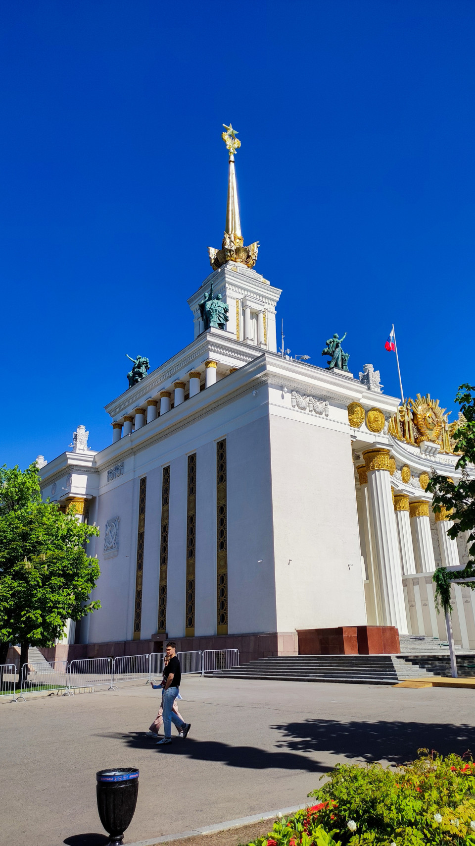 вднх москва архитектура культурное наследие объект культурного наследия памятник архитектуры советская архитектура архитектура ссср общественное пространство туристический объект городской пейзаж ВДНХ павильон №1 Центральный павильон Москва фасад шпиль колоннада позолота скульптуры историческое здание пешеходная зона посетители выставочный центр монументальный стиль летний день зелёные насаждения дерево обзор здания архитектурный ансамбль детали фасада достопримечательность пешая прогулка городской ландшафт туризм площадь ВДНХПохожие фотографии