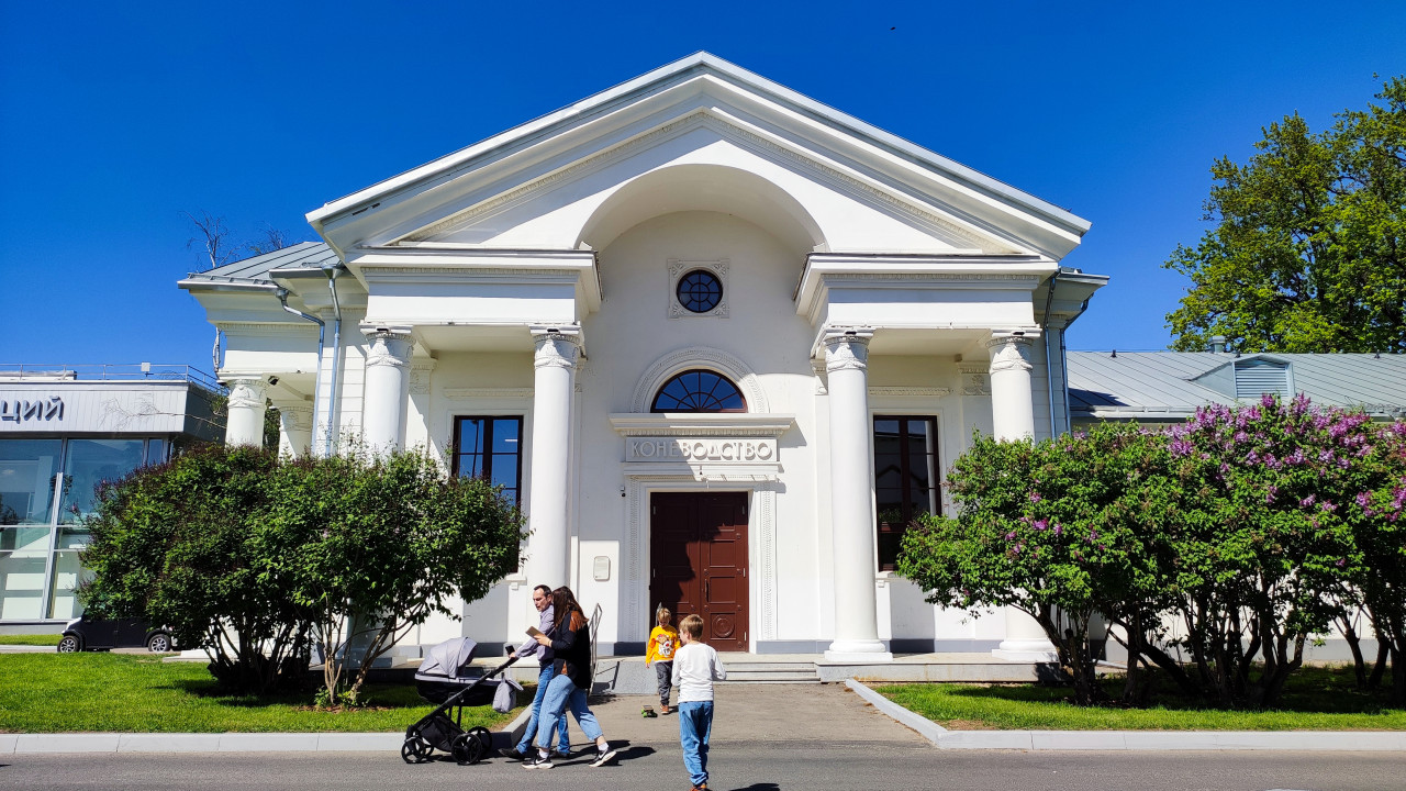 На изображении запечатлён павильон «Коневодство» на территории ВДНХ, выполненный в формах советского неоклассицизма с колонным портиком и симметричным фасадом. Здание относится к ансамблю выставки, сформированному в 1930–1950-х годах, и является объектом культурного наследия. Перед павильоном видна пешеходная зона, посетители с детьми и элементы озеленения. Фотография сделана днём в ясную погоду и может использоваться в материалах о ВДНХ, архитектуре Москвы, семейном отдыхе и культурном туризме.