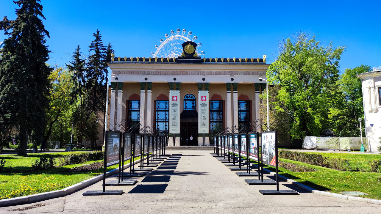 На фотографии запечатлён павильон №5 ВДНХ, построенный в 1952–1954 годах в стиле сталинского ампира и являющийся объектом культурного наследия. Перед входом организована выставочная аллея из информационных стендов, установленных по обе стороны дорожки. На фасаде заметны барельефы, декоративные элементы и крупные окна. В верхней части кадра виден фрагмент колеса обозрения, расположенного за павильоном. Слева и справа находятся зелёные зоны с деревьями и кустарниками. Фото подходит для материалов о городской среде, выставках, архитектуре ВДНХ и культурных программах Москвы.