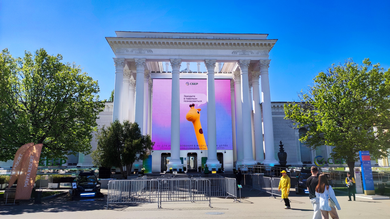 Павильон Сбера на ВДНХ с LED-экраном на колоннаде