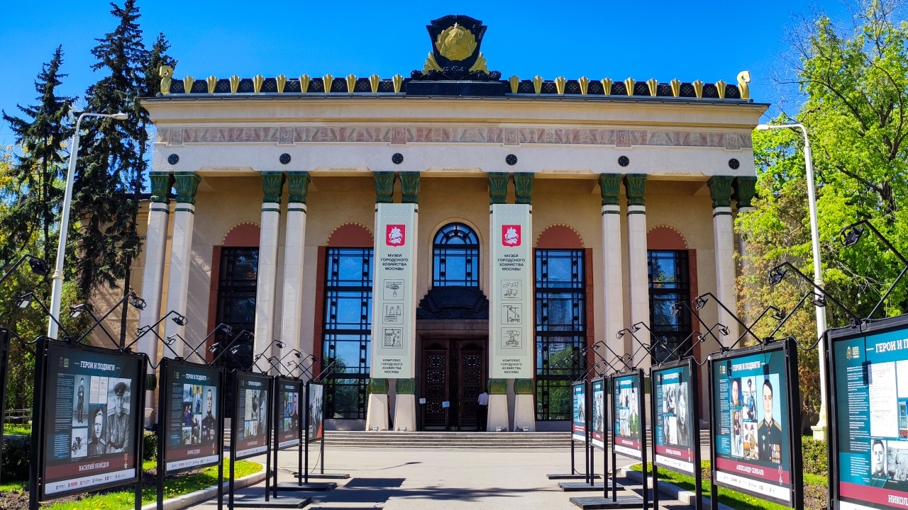 Фотография демонстрирует центральный вход павильона №5 ВДНХ, выполненного в стиле сталинского ампира и построенного в 1952–1954 годах. На фасаде заметны колонны с зелёными капителями, декоративный фриз и крупный герб. Перед зданием установлена экспозиция с информационными стендами, посвящёнными героям и тематическим проектам городского развития. Вокруг расположены зелёные насаждения и деревья. В глубине кадра видны сотрудники музея у входной группы. Фото подходит для использования в публикациях об архитектурных объектах ВДНХ, музейных программах и городских мероприятиях.