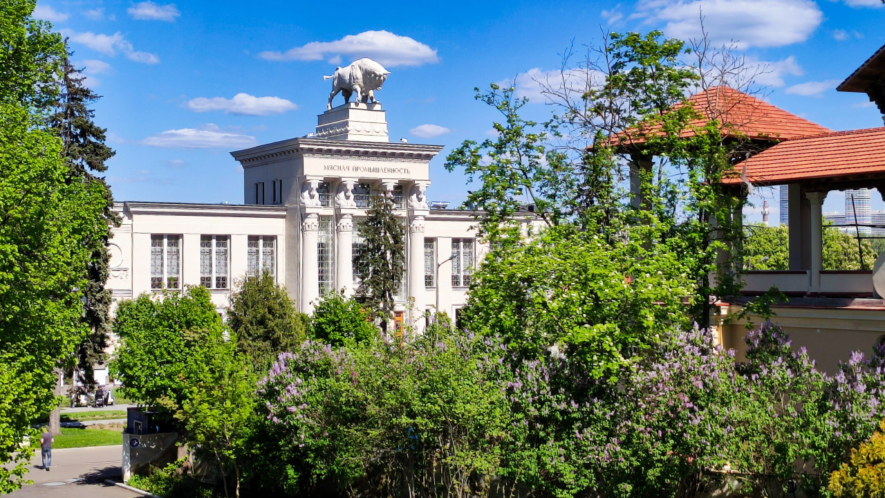 Павильон «Мясная промышленность» среди зелёных насаждений ВДНХ
