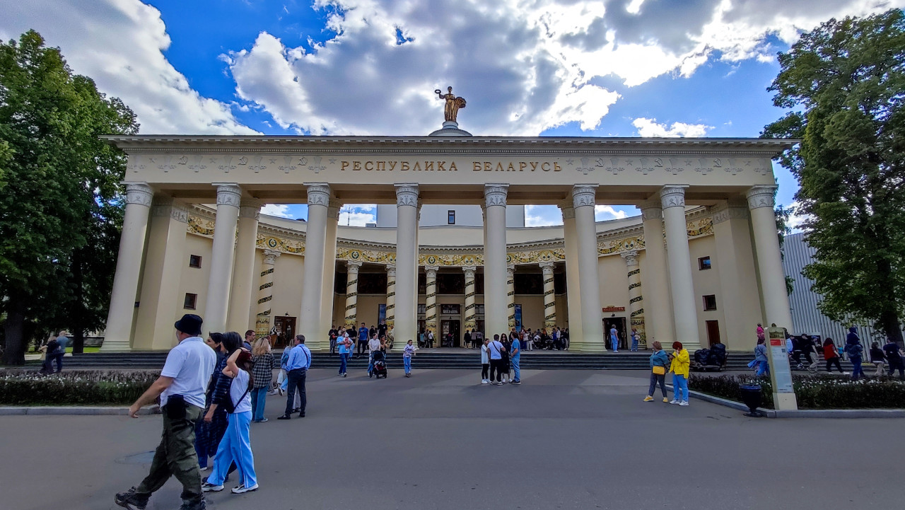 вднх москва архитектура павильон культурное наследие объект культурного наследия советская архитектура сталинский ампир историческое здание выставочный комплекс общественное пространство городской пейзаж туристический объект ВДНХ павильон Республика Беларусь Москва архитектурный ансамбль колонны фасад национальная экспозиция посетители архитектура советского периода выставочный павильон декоративный фасад городская среда международная выставка культурные мероприятия музейный формат дневное освещение архитектура ВДНХ прогулочная зонаПохожие фотографии