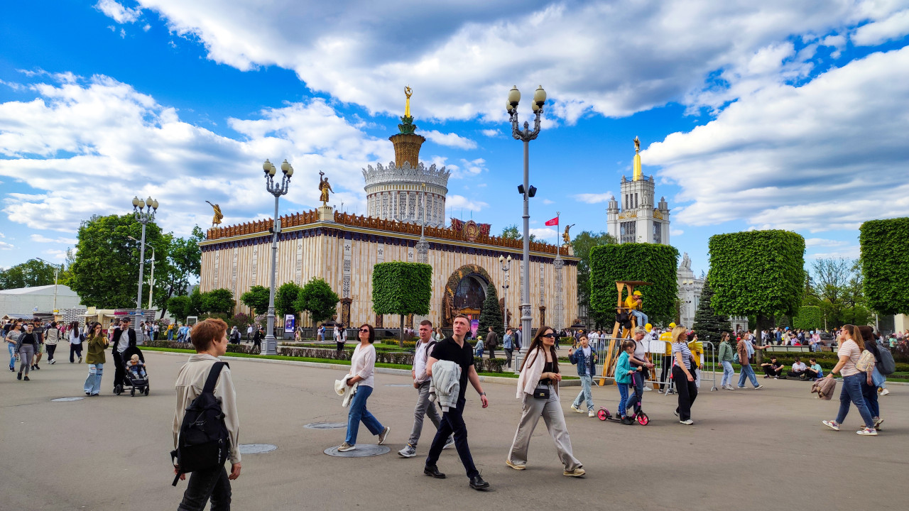 Павильон №58 «Земледелие» и посетители на центральной аллее ВДНХ