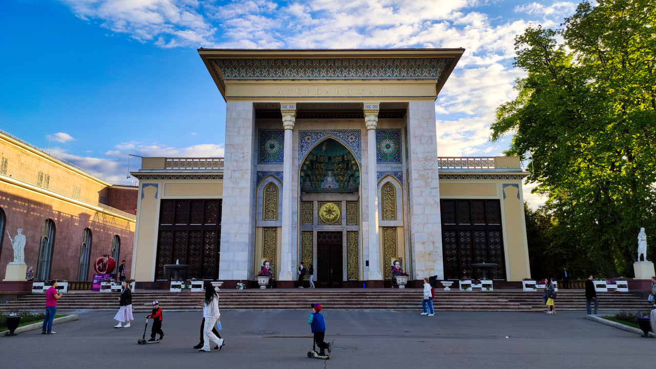вднх москва архитектура павильон культурное наследие объект культурного наследия советская архитектура сталинский ампир историческое здание выставочный комплекс общественное пространство городской пейзаж туристический объект ВДНХ Москва павильон Азербайджан национальный павильон павильоны ВДНХ памятник архитектуры фасад здания арка орнамент декоративные панели национальные мотивы архитектура СССР посетители прогулка достопримечательности Москвы история ВДНХ архитектурный ансамбльПохожие фотографии