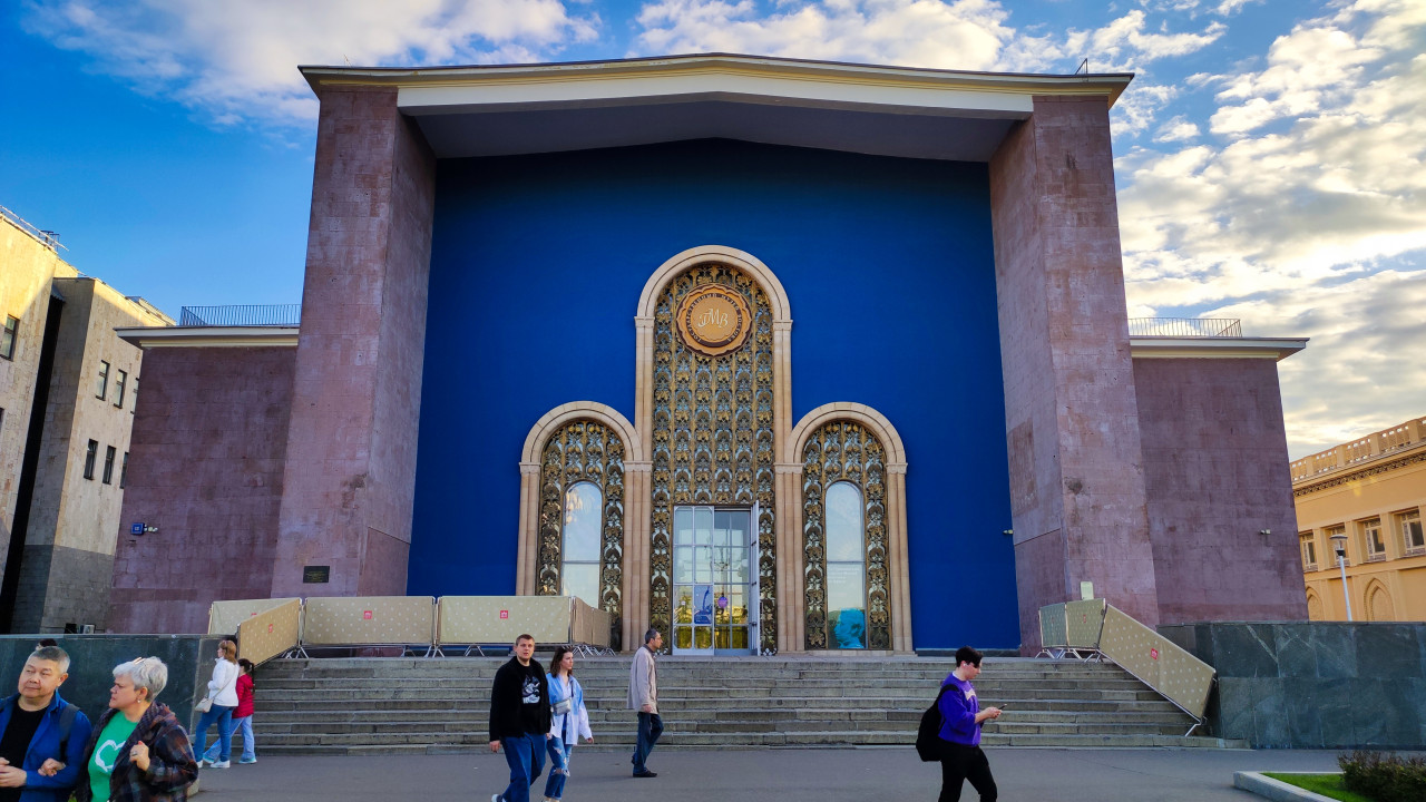 На фотографии изображён павильон №13 на территории ВДНХ в Москве, в котором с 2019 года располагается Музей Рерихов — филиал Государственного музея искусства народов Востока. Здание является одним из немногих павильонов довоенной выставки и было построено в 1938 году по проекту архитекторов Каро Алабяна и Самвела Сафаряна. В кадре виден монументальный фасад с широкой лестницей, центральной стеной синего цвета и высокими арочными окнами с декоративными решётками. Изначально павильон был посвящён культуре и достижениям Армянской ССР, позднее использовался для экспозиций «Пищевая промышленность» и «Здравоохранение». Съёмка выполнена в дневное время, перед зданием находятся посетители выставки.