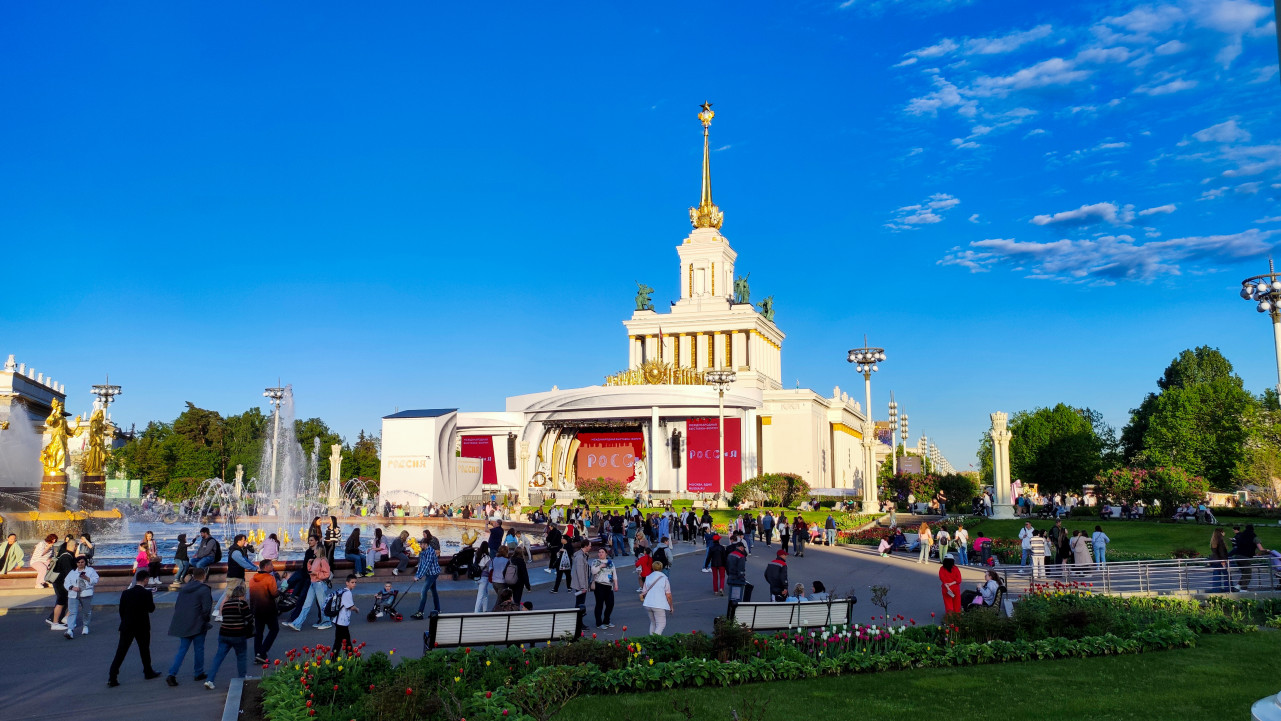 На снимке изображён Центральный павильон ВДНХ в Москве, являющийся объектом культурного наследия и одним из символов выставочного комплекса. Здание с высоким шпилем и звездой выполнено в стиле сталинского ампира и было построено в 1950-х годах как главный павильон Выставки достижений народного хозяйства. Перед павильоном расположена широкая площадь с фонтанами, клумбами и прогулочными дорожками, заполненная посетителями. Видны скамейки, фонари и элементы благоустройства. Фотография снята в тёплое время года при ясном небе и подходит для иллюстраций, посвящённых истории ВДНХ, архитектуре СССР, туризму и городской культуре.
