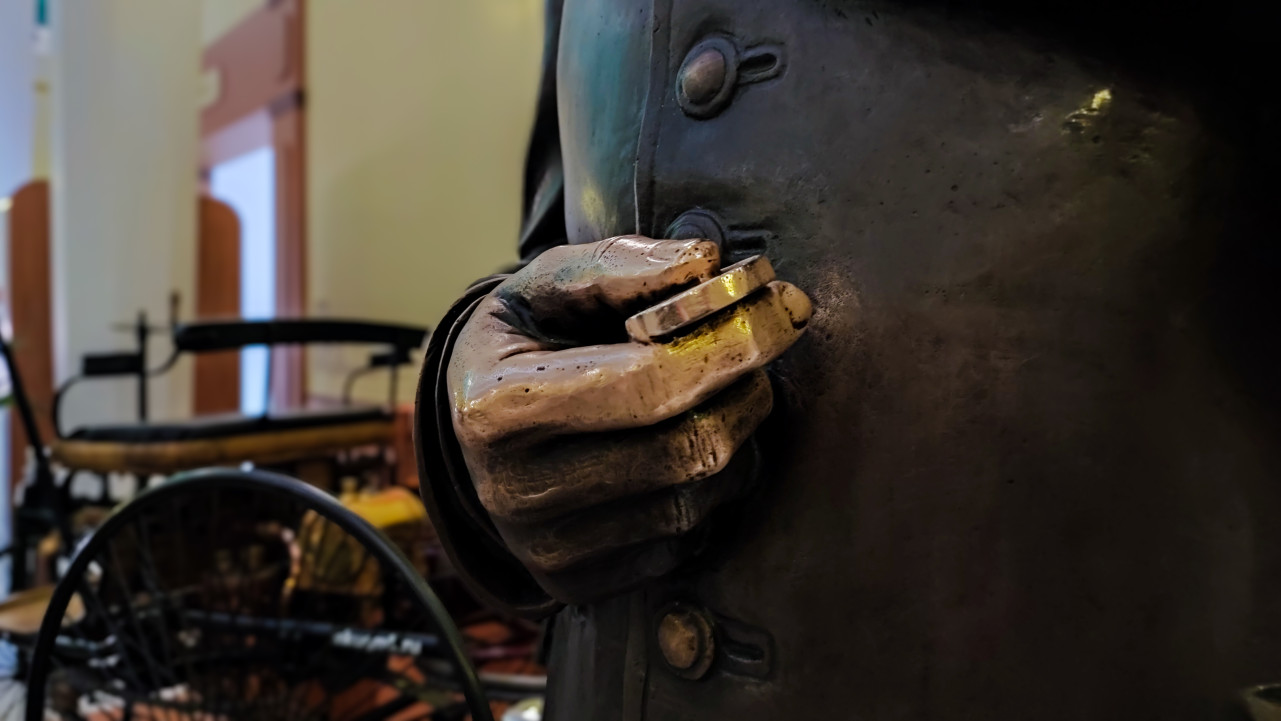 На фотографии крупным планом показана часть музейной инсталляции из исторического офиса павильона Сбера на выставке «Россия» на ВДНХ, оформленного в стилистике середины XX века. В кадре видна металлическая скульптурная рука, удерживающая жетон или монету, что отражает тему финансовых операций и работы сбережений. На заднем плане различимы элементы старинного помещения, включая колесо от раннего механизма или оборудования, характерные для ретро-экспозиций. Изображение можно использовать для материалов о банковской истории, музейных выставках и ретроспективных инсталляциях.