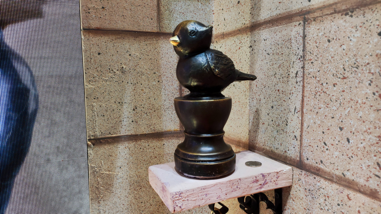На фотографии представлена миниатюрная анималистическая скульптура «Чижик-Пыжик», размещённая в экспозиции, посвящённой Санкт-Петербургу. Объект выполнен в виде небольшой птицы и установлен на декоративной подставке у стены выставочного стенда. Оригинальная скульптура «Чижик-Пыжик» находится в Санкт-Петербурге на набережной реки Фонтанки и была установлена в 1994 году, став одним из узнаваемых городских символов. Данный экземпляр используется как художественный образ региона в Павильоне №75 Международной выставки-форума «Россия» на ВДНХ в Москве. Фотография подходит для иллюстраций о городских символах, культуре регионов и выставочной деятельности.