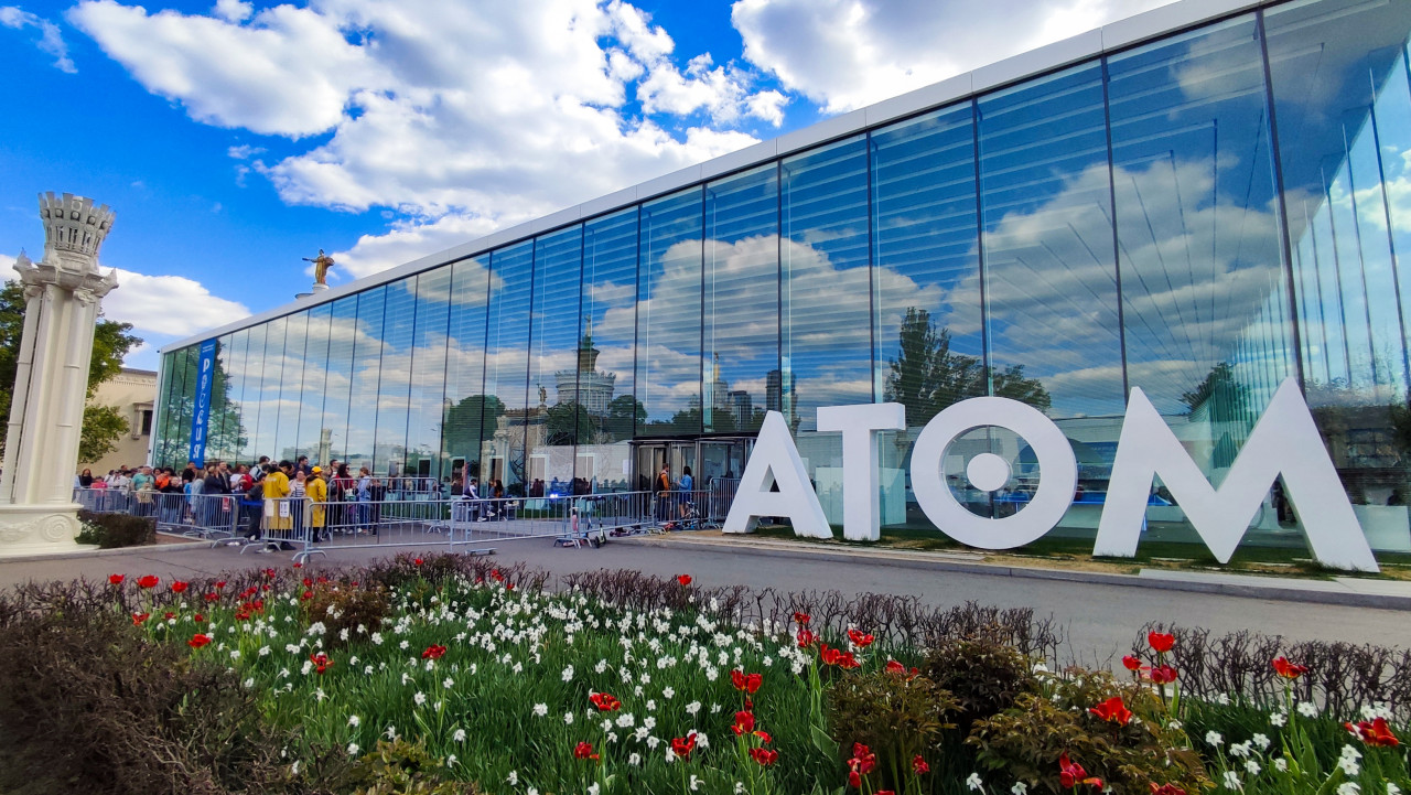 На фотографии показана очередь посетителей у павильона «АТОМ», расположенного на Главной аллее ВДНХ. В кадре видны люди, временные ограждения, стеклянный фасад здания, цветочные клумбы и элементы благоустройства территории. Павильон открылся в 2023 году и стал одним из самых посещаемых объектов выставки «Россия», предлагая экспозиции об истории ядерного проекта и современной атомной промышленности. Снимок отражает популярность объекта и может использоваться в материалах о массовых культурных событиях, выставках и общественной жизни города.