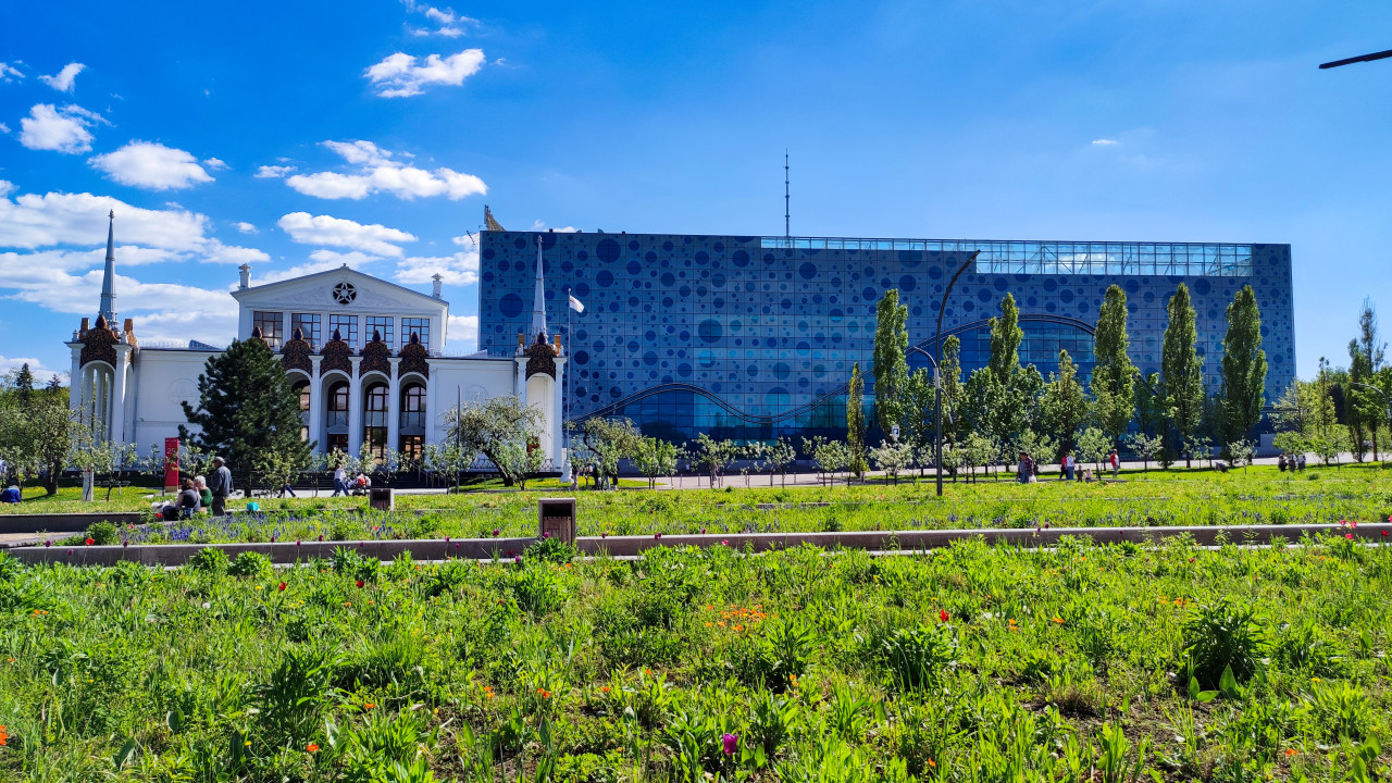 Москвариум и павильон № 25 «Нефть» среди цветников ВДНХ