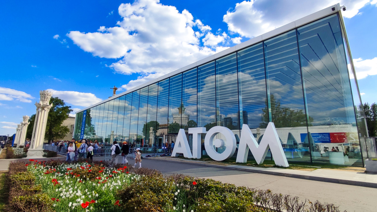 На фотографии запечатлён павильон «АТОМ» на ВДНХ, снятый с внешней стороны со стороны пешеходной аллеи. В кадре виден стеклянный фасад здания с отражением неба, облаков, деревьев и архитектурных объектов выставочного комплекса, а также крупная объёмная надпись «АТОМ», установленная перед павильоном. На переднем плане расположены цветочные клумбы и элементы благоустройства, вдоль фасада — посетители. Павильон открыт 4 ноября 2023 года и является крупным научно-просветительским пространством, посвящённым истории ядерной эпохи и атомной промышленности. Фотография подходит для материалов о современной архитектуре ВДНХ и музейной инфраструктуре.