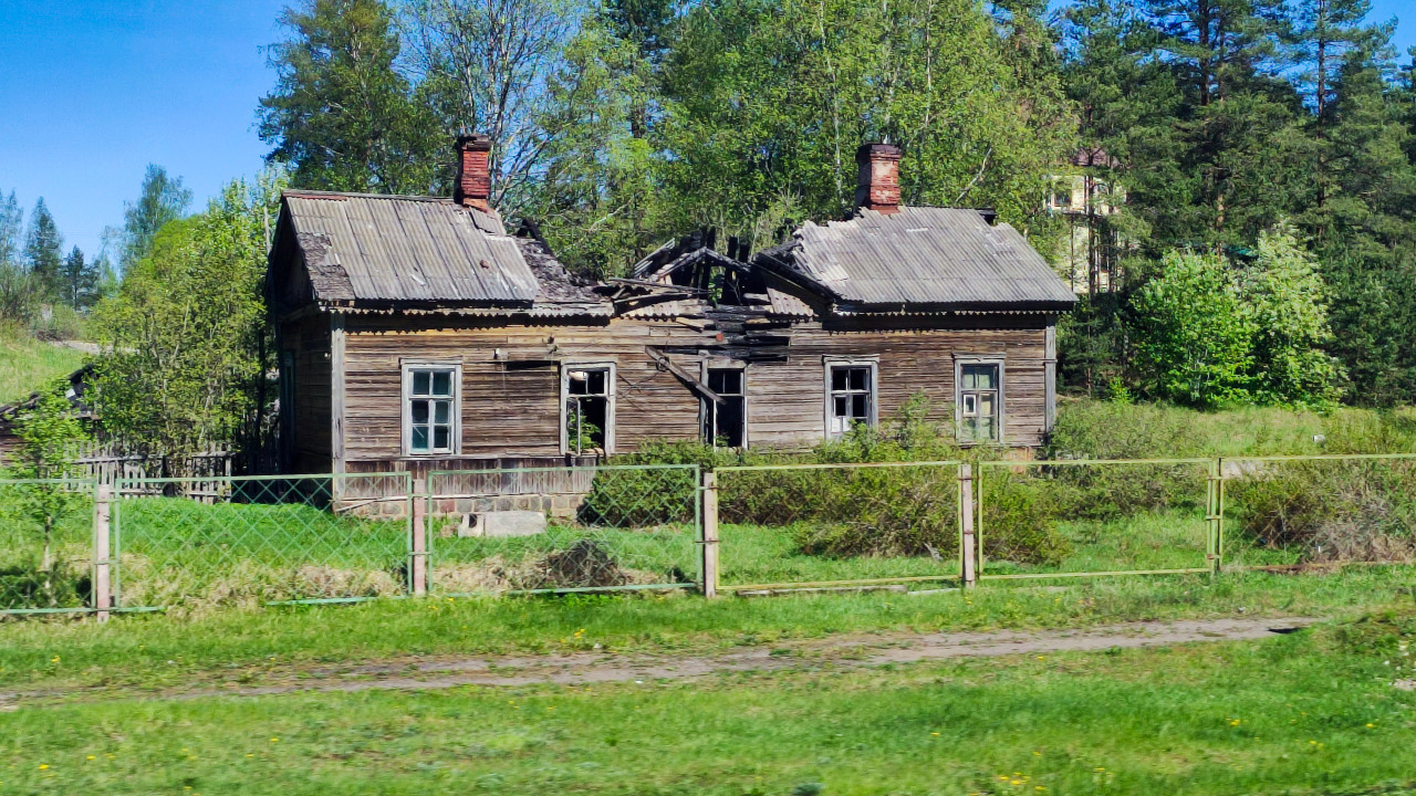 На фото запечатлён старый деревянный жилой дом, находящийся в разрушенном состоянии. Крыша здания частично провалилась, центральная часть перекрытий обрушена, а стены и оконные рамы заметно изношены. Дом выполнен из деревянных бревенчатых конструкций, характерных для сельской застройки начала XX века, однако точная дата не указана. Перед домом расположена низкая ограда и участок с растительностью. На заднем плане видны деревья и кустарники, подчёркивающие удалённость строения от городской среды. Съёмка выполнена днём при ярком солнечном свете. Фотографию можно использовать для материалов о заброшенных зданиях, архитектурном наследии сельских поселений, исследовании руинированных объектов и развитии деревень.