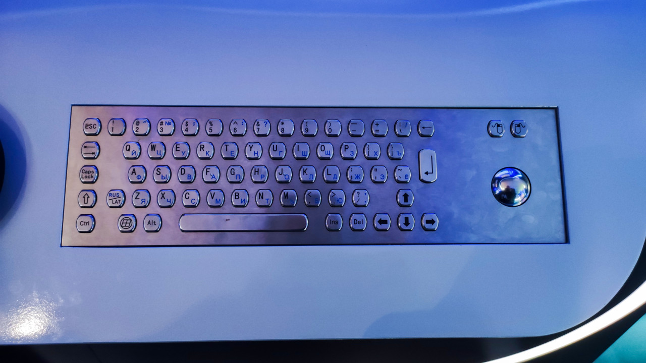 На изображении видна панель встроенной металлической клавиатуры терминала, занимающая центральную часть кадра. Устройство имеет ряды металлических кнопок с кириллическими и латинскими символами, а справа расположен шаровый манипулятор. Освещение зала создаёт отражения на поверхности, подчеркивая форму кнопок. Снимок сделан в павильоне Сбера на выставке «Россия» на ВДНХ. Фотография подходит для иллюстрации интерфейсных решений, терминального оборудования и публичных цифровых систем.