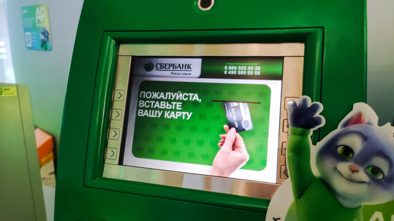 Экран банкомата Сбера с уведомлением о необходимости забрать карту