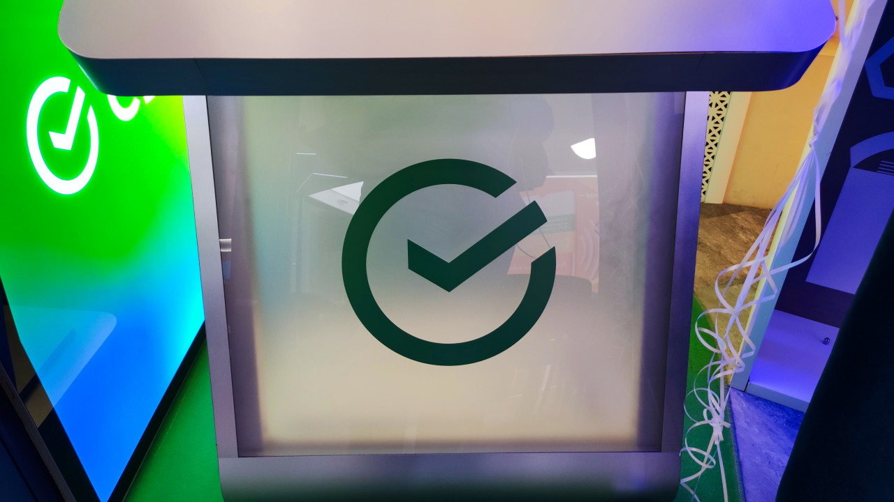 На фотографии запечатлён логотип Сбербанка в виде фирменного символа с галочкой, размещённый на фронтальной панели банкомата. Корпус устройства выполнен в современном дизайне с подсветкой и встроенным экраном, предназначенным для проведения банковских операций. Снимок сделан внутри выставочного пространства павильона Банка России «Умные финансы» в павильоне №71 ВДНХ в период работы выставки «Россия» в 2023–2024 годах. Экспозиция демонстрировала развитие цифровых и платёжных технологий, включая самообслуживание клиентов. Фотография подходит для иллюстраций материалов о банковской инфраструктуре, безналичных сервисах и современных финансовых технологиях.