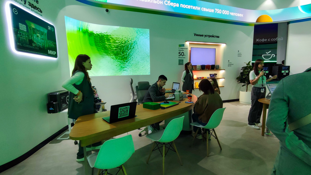 вднх выставка россия москва павильон сбера музей экспозиция консультация Сбер сотрудники посетители ВДНХ выставка Россия сервис финтех умные устройства зона обслуживания интерьер цифровые экраны презентация общение рабочее место интерфейс технология демонстрация клиентский опыт офисная зона реклама оборудование инновации интерактив атмосфера обслуживание брендПохожие фотографии