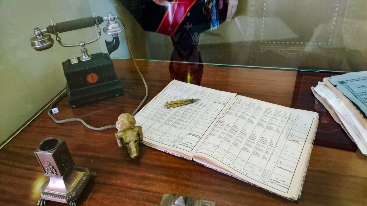 Телефонный аппарат и документы в исторической экспозиции Сберегательной кассы